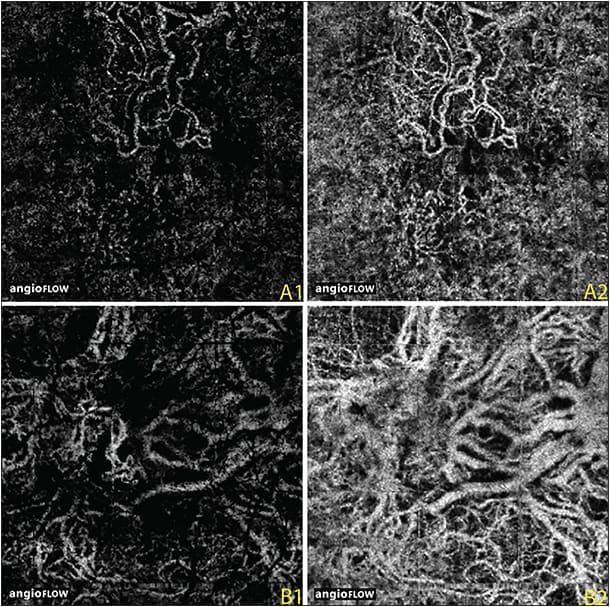 Figure 3. OCTA images, 3 mm x 3 mm, of two eyes with neovascular age-related macular degeneration. OCT angiogram of the outer retina in one eye shows lacy choroidal neovascularization (A1); the underlying choriocapillaris shows abnormal vessels below the CNV that appear to feed into the neovascularization. OCTA of the outer retina (B1) in the second eye shows a poorly circumscribed CNV. A larger net is seen below in the underlying choriocapillaris (B2).
