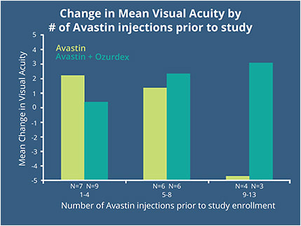 Figure 1. In Maturi et al., continued repeated Avastin injections did not provide a visual benefit in the Avastin alone group of DME patients. However, patients in the combination therapy group who had received the most Avastin injections prior to study enrollment gained the most vision with the addition of Ozurdex.
