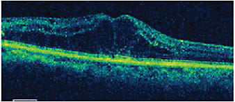 The patient was retreated with Lucentis followed by Ozurdex 2 weeks later (Figure 4). One month later, CFT had decreased to 274 µm and visual acuity had improved to 20/40+2 (Figure 5).