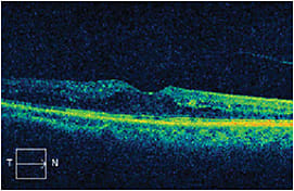 Six weeks after combination therapy, the CFT had decreased to 352 µm and visual acuity had improved to 20/60-2 (Figure 2). The swelling remained stable for 3 months (Figure 3), after which the CFT increased to 546 µm.