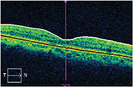 Three months later, (4 months after the Lucentis injection), the swelling recurred (Figure 6), and the patient was treated again with Lucentis followed by Ozurdex 2 weeks later. Her OCT CFT decreased to 226 µm and visual acuity improved to 20/30-2 (Figure 7). The patient’s visual acuity and CFT have remained stable for 2 months. We will continue with this regimen if the swelling recurs or the vision degrades.