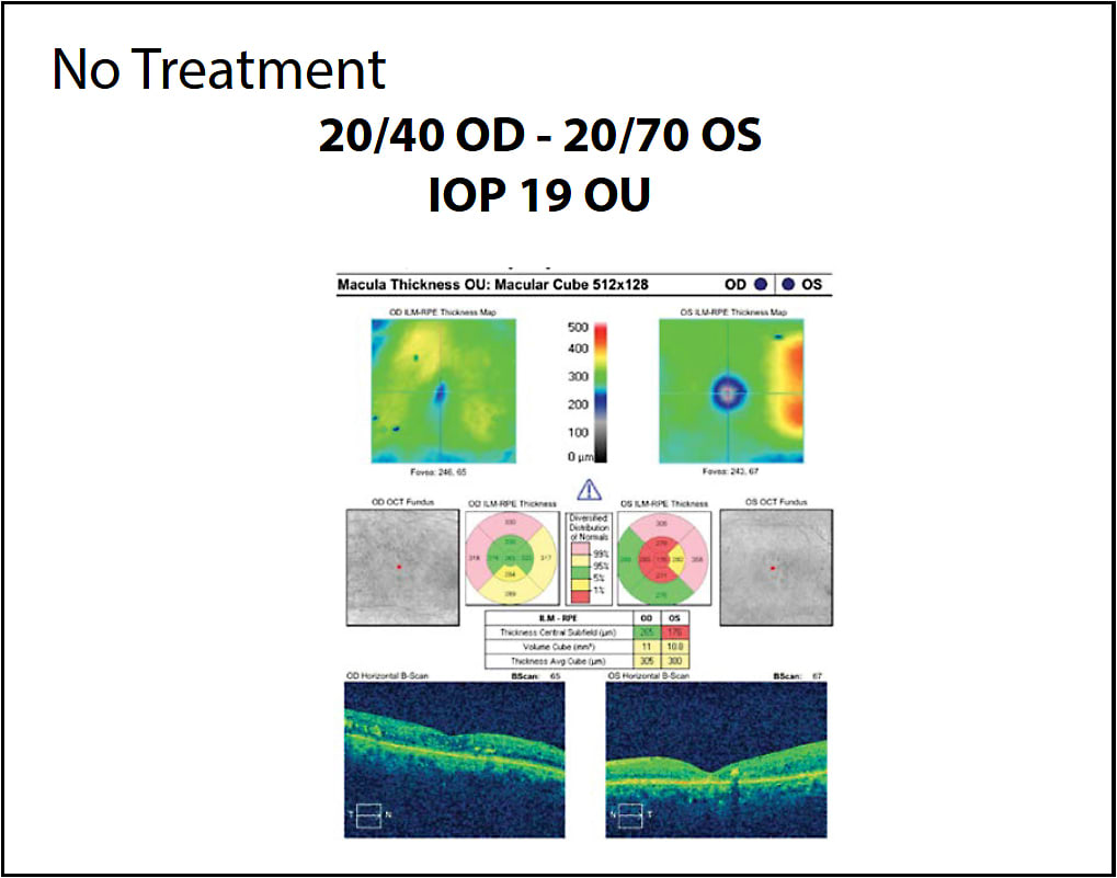 On follow-up, I determined that the patient’s visual acuity did not improve in either eye and the macular edema was slightly worse in the right eye and about the same in the left eye (Figure 4). I adjusted my treatment paradigm and proceeded with an injection of Ozurdex 0.7 mg in each eye.