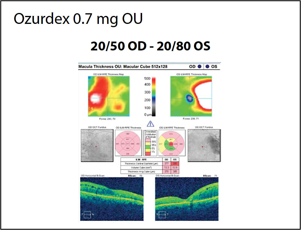 The patient and I were happy with the dramatic improvement in anatomic response as shown on OCT and visual acuity in both eyes (20/40 OD, 20/70 OS) after switching our course of action (Figure 5). Given that the central macula was dry in both eyes almost 2 months after administering Ozurdex, we decided to withhold treatment at this visit.