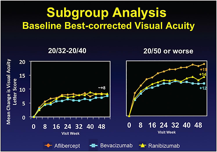 Although mean improvement in VA letter score for the entire study population was also greater with Eylea than with the other two drugs, the authors of the study reported that advantage as not clinically meaningful. John A. Wells, MD, lead author, explains: “The overall result, while favoring Eylea, has limited clinical utility because that was not the case for eyes with better baseline vision. All three agents gave equal improvement in that subgroup. In other words, the overall result has limited clinical utility because it can’t be applied to all eyes; the difference was driven by the eyes with worse visual acuity at baseline. Statistically speaking, when there is a strong interaction with a prespecified subgroup analysis, in this case the interaction between treatment and baseline visual acuity, the overall result has limited meaning.”