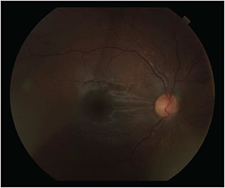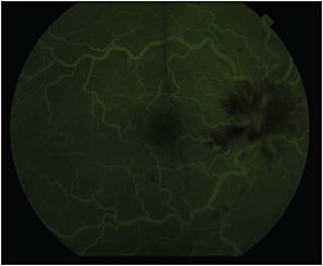 A 12-year-old boy with a history of acute lymphocytic leukemia, who was undergoing chemotherapy with intrathecal methotrexate and vincristine, was sent to the Krieger Eye Institute from the hematology/oncology clinic at Sinai Hospital of Baltimore, MD, for new-onset blurred vision and central vision loss in the right eye for one day. His medical history was also significant for chronic anemia secondary to the chemotherapy, which required multiple transfusions. The patient had no prior ocular history.