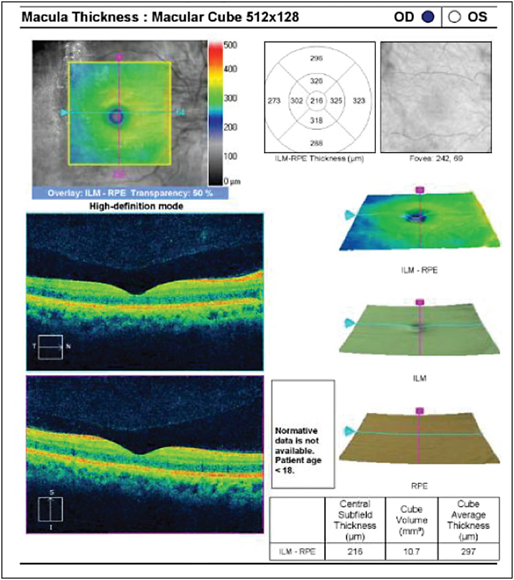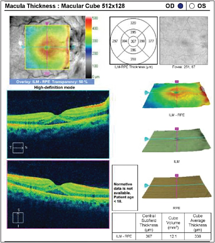 Fluorescein angiography demonstrated leakage of the disc and macula in the right eye. Macular optical coherence tomography (Carl Zeiss Meditec, Dublin, CA) showed subretinal fluid in the right eye and was normal in the left eye (Figure 2, page 62). Magnetic resonance imaging of the orbits showed no acute abnormality. His hemoglobin and hematocrit levels at the time were 7.6 and 23.7, respectively.