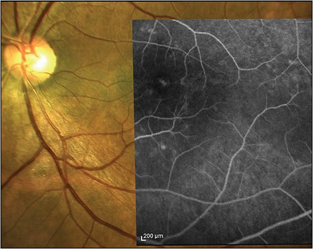 Figure 2. Figure shows use of multimodal imaging on Navilas. Fundus fluorescein angiography image, done on another system, has been imported into the Navilas system. Fundus fluorescein angiography image is overlaid on color fundus photo, obtained using Navilas and used for laser planning.