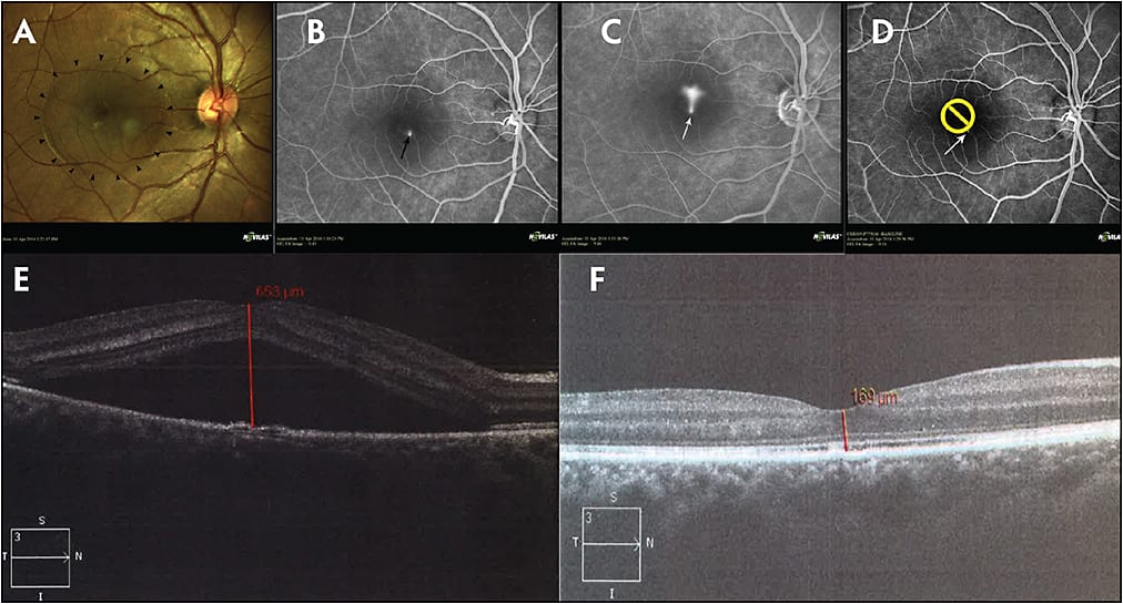 Figure 3. Composite figure shows treatment outcome of laser photocoagulation in an eye with central serous chorioretinopathy. Color fundus photograph (A) shows area of subretinal fluid (arrowheads). Fundus fluorescein angiography, early (B) and late (C) phases, shows point leak (arrow in B) with typical smoke stack appearance. D) Laser planning on Navilas; large yellow circle shows no-laser zone, and small yellow spot shows planned single laser spot (arrow). Spectral-domain optical coherence tomography shows the presence of subretinal fluid on prelaser (E) and the resolution of subretinal fluid at one month follow-up (F).