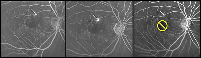 Figure 1. Fundus fluorescein angiography images (left panel: midphase; middle panel: late phase) showing point of leak (arrow) in an eye with central serous chorioretinopathy. Right panel shows the laser plan with yellow spot (arrow) on planned laser spot with no-laser zone (yellow circle).