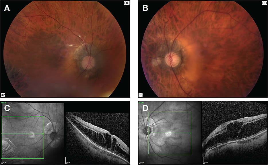 Figure 1. Color fundus photos of the right (A) and left (B) eyes and the corresponding OCT images (C and D) of a 43-year-old female patient with myopic foveoschisis. Best-corrected visual acuity was 20/40 bilaterally.