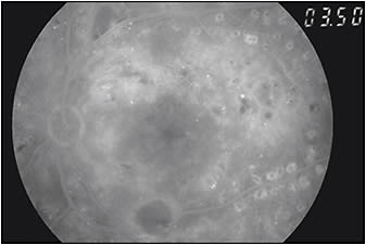 Figure 12. Diffuse CSME with very severe NPDR and signs of laser scars.
