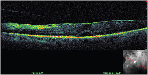 Figure 15. Same patient as in Figure 14. OCT shows suboptimal response after four injections of anti-VEGF and no improvement in BCVA.