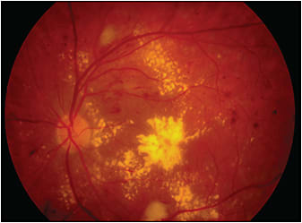 Figure 14. Diffuse thickening of the central macular area with cystic changes, neurosensory detachment, and hard exudates. BCVA is 20/60.