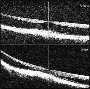 Figure 5. Pre- and postoperative OCT images of chronic macular schisis, tractional retinal detachment, and a lamellar macular break. The postoperative view is four months after the surgical intervention. Visual acuities were 20/60 preoperatively and 20/50 at four months. More settling of the detachment may still occur.