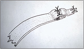 The positioned strip’s ends are cut to length and secured to the recipient eye’s sclera in its superonasal and inferonasal quadrants (Figure 1). Following the strip’s placement, tension is created in it, using a pair of preplaced sutures to produce an adjustable tuck close to its superior end (Figure 2).