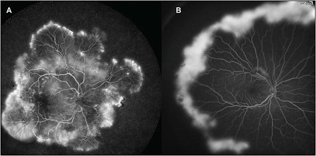 Figure 1. Widefield angiography in retinal vascular disease with center-periphery mismatch pathology. A) A 47-year-old male smoker with no previous history of diabetes; examination revealed microaneurysms without edema, while widefield angiography discloses diffuse peripheral neovascularization and ischemia. B) A 15-year-old with sickle cell retinopathy; posterior-pole examination was unremarkable, but widefield angiography reveals the extent of the proliferative disease. Images obtained with RetCam (Clarity Medical Systems, Pleasanton, CA).