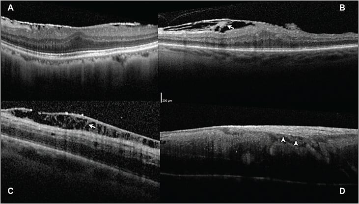 Figure 4. Differentiating epimacular membrane using SD-OCT morphology. A) Patient with typical idiopathic epimacular membrane with a single hyper-reflective line, likely vitreous on the macular surface. B) Patient with macular PVR, or epimacular membrane in the context of previously untreated retinal breaks, with finger-like projections spanning the retina and membrane (arrow). C) Patient with multiple previous vitrectomies and perimacular PVR in an area of previous ILM peeling, demonstrating distinct finger-like projections spanning epiretinal membrane. D) Vascularized epimacular membrane in a patient with a retinal vasoproliferative tumor, demonstrating a blood vessel (arrow) between its inner surface and the nerve fiber layer. Images obtained with Heidelberg OCT.