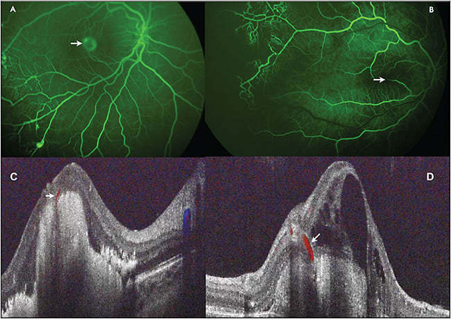 With the roughly 3- to 5-µm resolution of SD-OCT, structures such as distinct, isolated midretinal vasculature can be visualized. The lesions can be successfully treated with anti-VEGF therapy. These lesions commonly cause intraretinal fluid as the primary SD-OCT sign of exudation.