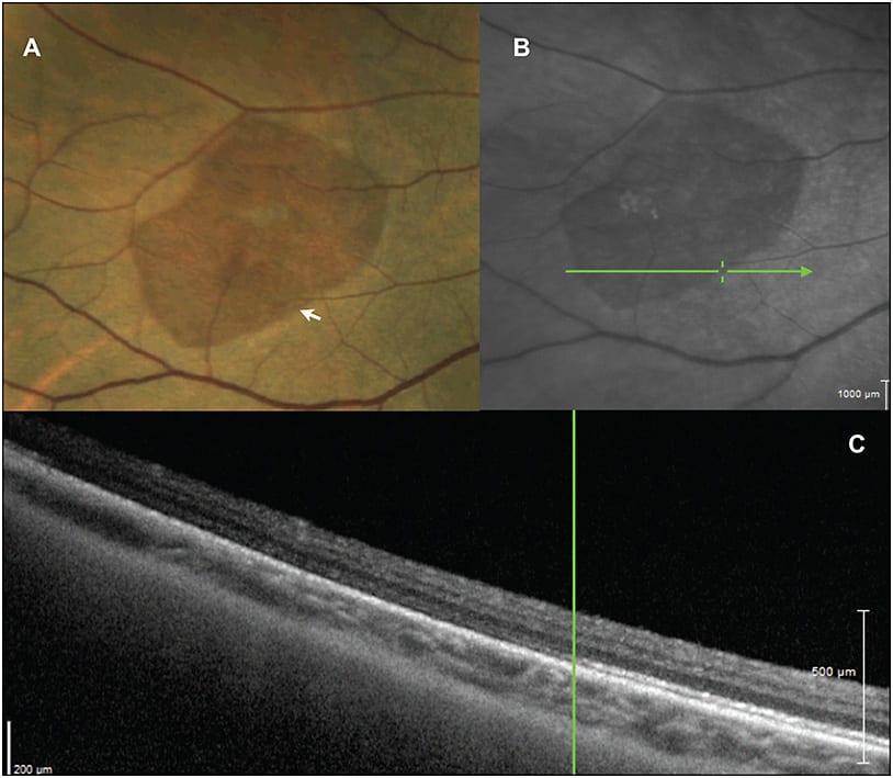 Figure 5. Peripheral multimodal imaging of “white without pressure.” A) Peripheral color photography demonstrating a relatively darker area in a region of white without pressure. B) SLO image of the region demonstrating scan position for SD-OCT. C) SD-OCT, showing a distinct hyper-reflective band at the ellipsoid zone, which is seen to abruptly end at the border of the outer retinal whitening. Images obtained with RetCam and Heidelberg OCT.