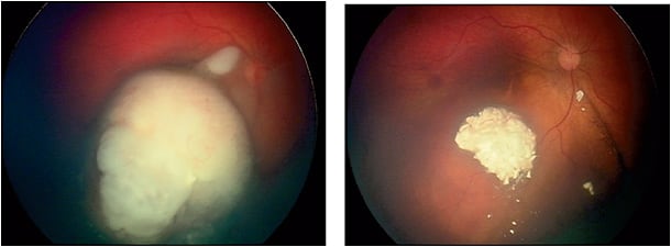 Figure 1. Before (left) and after (right) intra-arterial chemotherapy for Group D retinoblastoma with seeding.