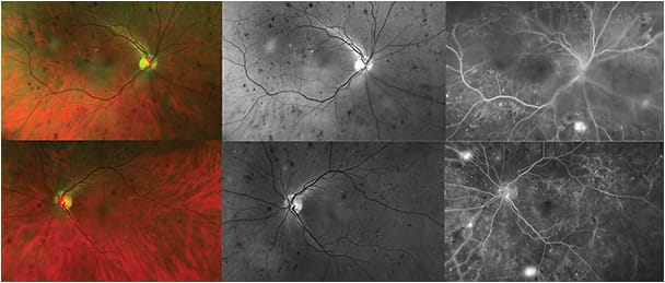 Proliferative diabetic retinopathy. Top row: Color, red-free, and fluorescein angiogram, right eye, showing microaneurysms, blot hemorrhages, exudates, and retinal capillary nonperfusion associated with retinal neovascularization inferior-nasal to the optic nerve. Bottom row: Left eye of the same individual showing similar findings, along with retinal neovascularization also superior-nasal to the optic nerve.