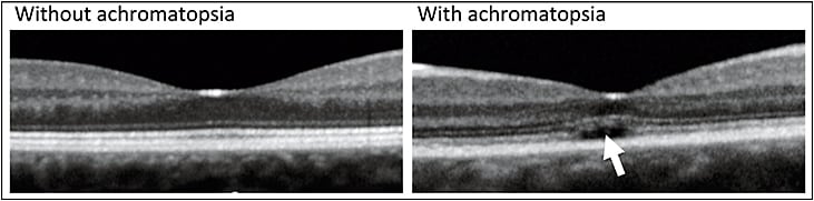 The retina usually appears normal by fundus examination, but there may sometimes be signs of foveal atrophy, macular granularity, or vascular attenuation.13 Optical coherence tomography imaging studies have reported that abnormalities in the outer fovea are present in more than three-quarters of patients with achromatopsia. These abnormalities include disruption or absence of the ellipsoid zone and/or retinal pigment epithelium, and in some cases, a complete absence of cells at the base of the fovea leaves an optically empty cavity, called a hyporeflective zone (Figure 3).8,15