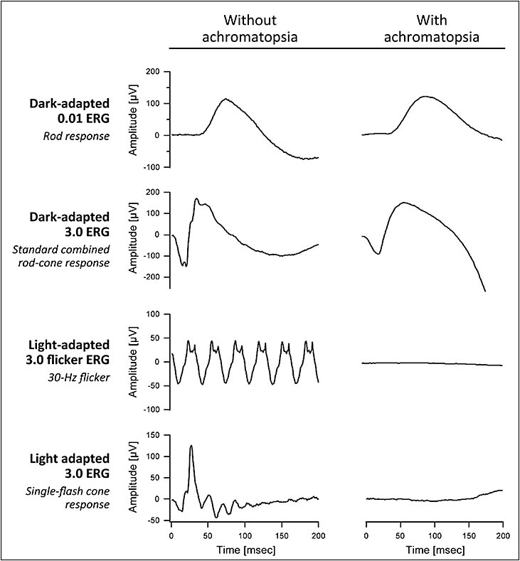 Achromatopsia is characterized by an absence of cone photoreceptor function, which manifests as decreased cone photoreceptor responses on photopic electroretinogram (ERG) (Figure 1). The only functioning photoreceptors are rod photoreceptors, although some patients also have decreased rod photoreceptor response on ERG.8,9