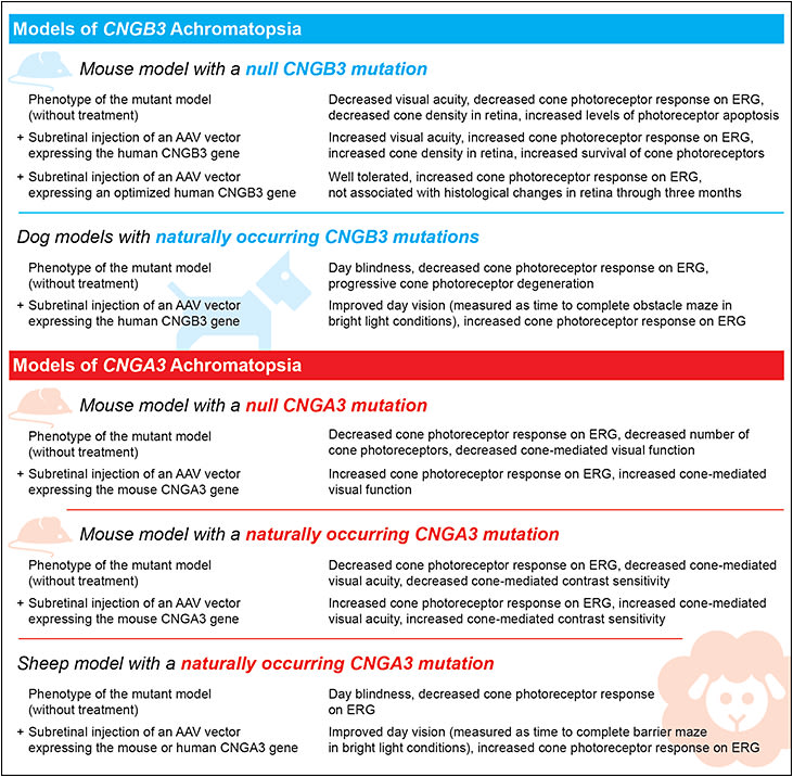 Animal models of achromatopsia have been extremely useful in the preclinical evaluation of potential gene therapy treatment options. Some of the models are naturally occurring genetic variants while others have been created through genetic engineering (Figure 4).