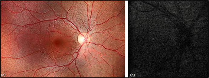 Figure 7. Fundus autofluorescence of fundus albipunctatus. Fundus photography (a) demonstrates multifocal white flecks in the midperiphery with macular sparing. FAF (b) shows profoundly decreased background autofluorescence and a grainy resolution.