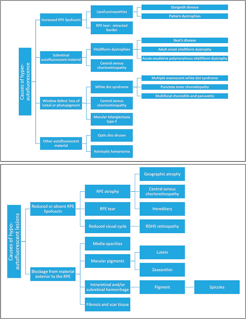 Figure 2. Causes of hyperautofluorescence (a). Causes of hypo-autofluorescence (b).