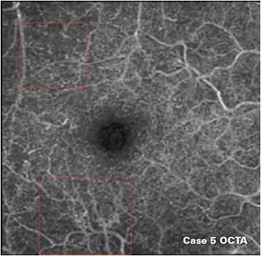OCTA detects blood flow without the use of intravenous dye, therefore eliminating the risk for complications, such as anaphylaxis. It is an excellent tool to detect subclinical microaneurysms, the earliest sign associated with diabetic retinopathy, that are often not perceived through a dilated retinal examination as depicted in case 5.