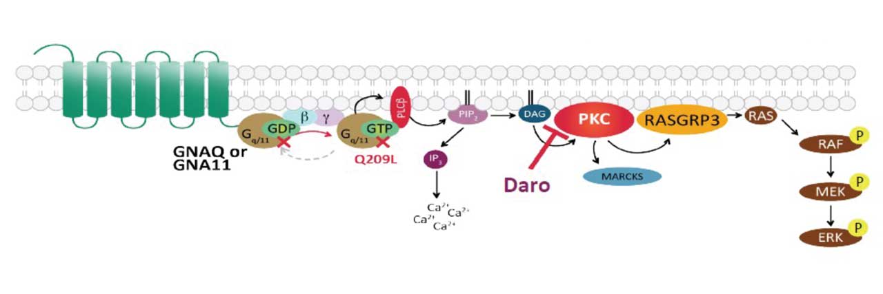 Figure 4. Darovasertib is an investigational selective inhibitor of protein kinase C, which blocks mutations in GNAQ/GNA11, a genetic driver of uveal melanoma. Used with permission from Ideaya Biosciences.