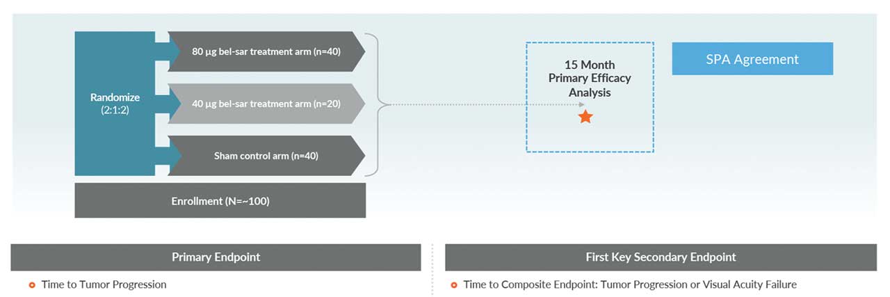 The trial will enroll at least 85 patients, and possibly up to 105 patients, across 60 centers. Patient included are those with treatment-naïve intraocular IL or small CM (excluding optic nerve proximity or invasion, and extraocular or systemic involvement) with documented growth or de novo presentation at screening. The trial includes 3 arms in a 2:1:2 ratio consisting of cycles of 3 weekly suprachoroidal injections of 80 μg bel-sar with laser, 40 μg bel-sar with laser, or sham with sham laser, respectively, for 3 monthly cycles, followed by observation of 15 months (Figure 2).