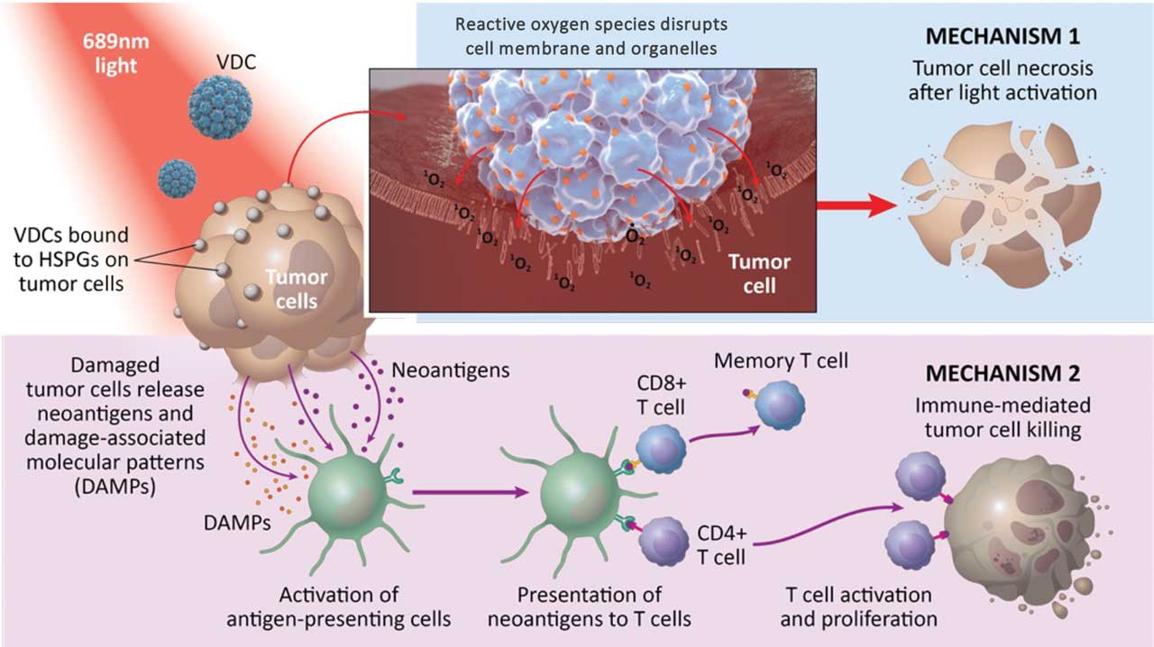 Figure 1. Delivery and mechanism of action of activation of AU-011 (belzupacap sarotalocan; Aura Biosciences) with a diode laser (689 nm; same as photodynamic therapy), the small molecules selectively destroy the cell membrane of malignant cells. Used with permission from Aura Biosciences.