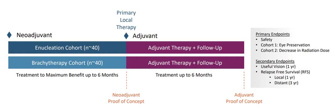 Figure 5. Design of the phase 2 study of darovasertib as neoadjuvant or adjuvant therapy in primary uveal melanoma. Used with permission from Ideaya Biosciences.