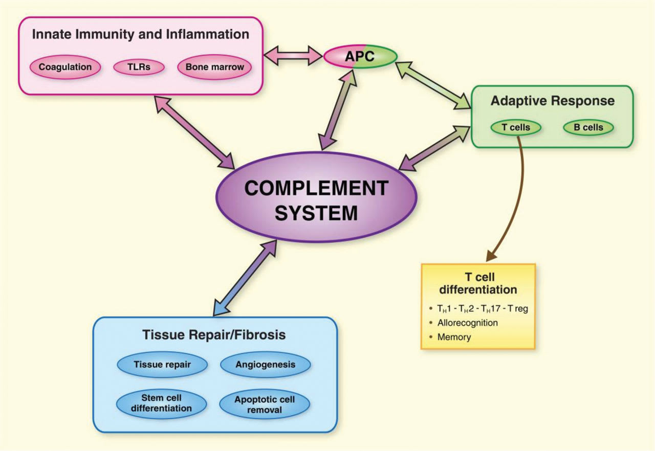 Figure 1. The central role of the complement system in immune response. In addition to its classical function in innate immunity, the complement system also plays roles in enhancing the adaptive immune response and modulating tissue repair and fibrosis. Image source: Danobeitia, et al (2014). Licensed for reuse under CC BY 4.0.