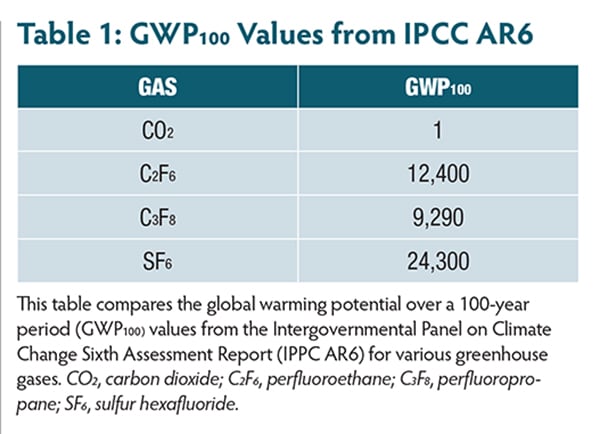 While fluorinated gases do not contribute to ozone depletion, they do have high global warming potential (GWP). GWP is a standardized metric used to compare how much a particular gas will warm the surface of the Earth when released into the atmosphere relative to carbon dioxide (CO2). It is typically expressed as the cumulative warming effect of one metric ton of a particular gas over a 100-year period (GWP100), with the warming potential of CO2 defined as 1. Fluorinated gases have exceptionally high warming potential, with SF6 gas having the highest GWP100 of any gas yet evaluated (Table 1).5 To facilitate comparisons, when discussing the contribution of a given quantity of gas to global warming, it is common practice to report the mass of CO2 which would cause an equivalent degree of warming (CO2e). This is calculated by multiplying the mass of a gas by its GWP100.