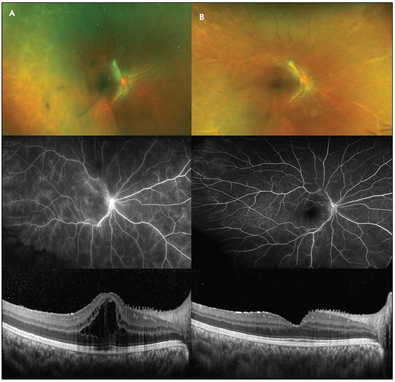 Figure 2. A 21-year-old female with intermediate uveitis with retinal vasculitis and cystoid macular edema of the right eye as seen on fundus photo, late-phase fluorescein angiography (FA), and optical coherence tomography (OCT), respectively. The patient was initially nonresponsive to a combination of an antimetabolite (methotrexate) and anti-TNF treatment (adalimumab 40 mg every week) (A). She had an excellent response when switched from adalimumab to intravenous tocilizumab 680 mg monthly, with resolution of angiographic leak on late-phase FA and cystoid macular edema on OCT 8 weeks after the switch (B).