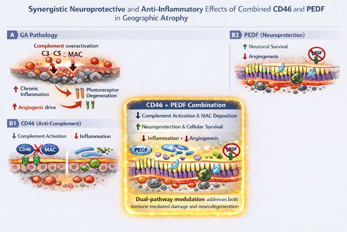 Figure 2. Dual-pathway therapeutic mechanism of combined CD46 and PEDF gene therapy for geographic atrophy (GA). GA pathophysiology involves complement overactivation through the C3-C5-MAC cascade, leading to chronic inflammation, increased angiogenic drive, and photoreceptor degeneration (A). Soluble CD46 (membrane cofactor protein) acts as a cofactor for complement factor I, catalytically inactivating C3b and C4b to suppress complement activation and MAC formation, thereby reducing inflammation (B1). PEDF provides direct neuroprotection, promoting neuronal survival while inhibiting VEGF-mediated angiogenesis (B2). The dual-pathway gene therapy approach (center) combines both mechanisms, simultaneously decreasing complement activation and MAC deposition, enhancing neuroprotection and cellular survival, and reducing both inflammation and angiogenic conversion risk.