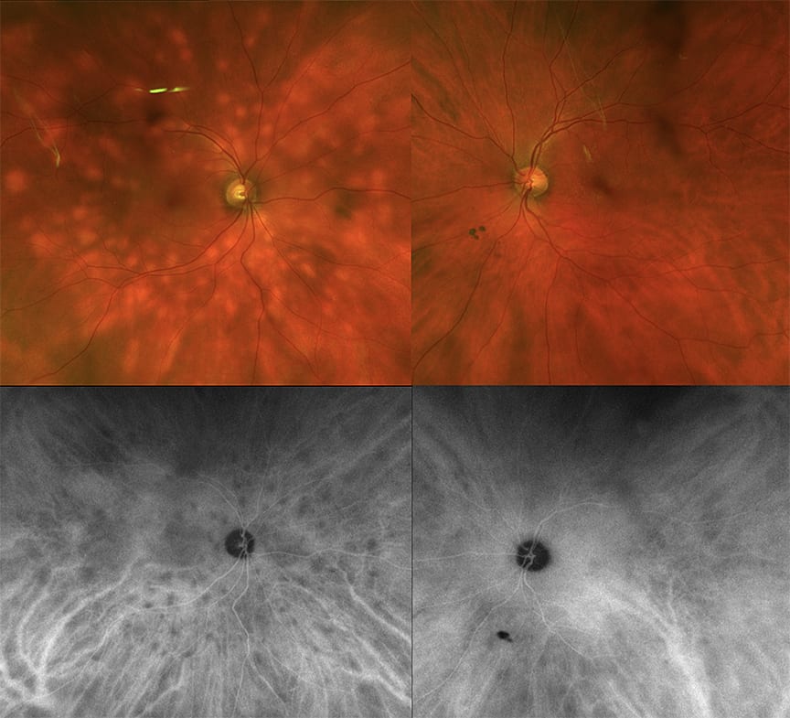 At a follow-up visit, the patient elected to undergo fundus photography for screening. Review of the images revealed concerning retinal findings, prompting referral to a retina specialist. The specialist examined the patient, obtained additional photographs, and performed angiography, leading to a diagnosis of birdshot chorioretinopathy (Figure 1). The patient was started on empiric high-dose oral glucocorticoid therapy while extensive laboratory testing, including HLA-A29 typing, was performed, which returned negative. Following these results, the patient was referred to a uveitis specialist.