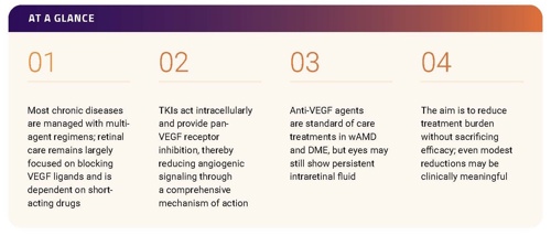 Do: For DME in particular, many clinicians are now hesitant to rely on anti‑VEGF monotherapy alone. Corticosteroids are often considered earlier, with some moving to dexamethasone or fluocinolone implants when response is incomplete after a few anti-VEGF injections. This reflects the complex and not yet fully defined molecular pathways underlying the disease. Current regimens likely do not address all drivers of pathology, and future therapies may target broader cytokine networks. The goal will be to deliver medications that act on multiple pathways with minimal ocular risk, enabling more complete and durable control. TKIs’ broader mechanism combined with sustained‑release drug delivery could lead to more consistent fluid control, less variability between visits, and reduced reliance on short‑acting monotherapy.