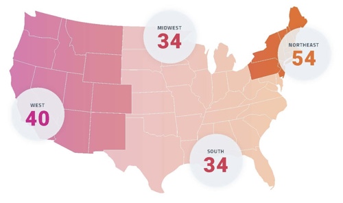 Retina may continue to rank among the least supplied surgical subspecialties relative to patient need. Regional disparities are evident, with the Northeast showing the highest concentration of retina specialists, and the South and Midwest showing the lowest. Note: Hawaii and Alaska are included in the West region.22